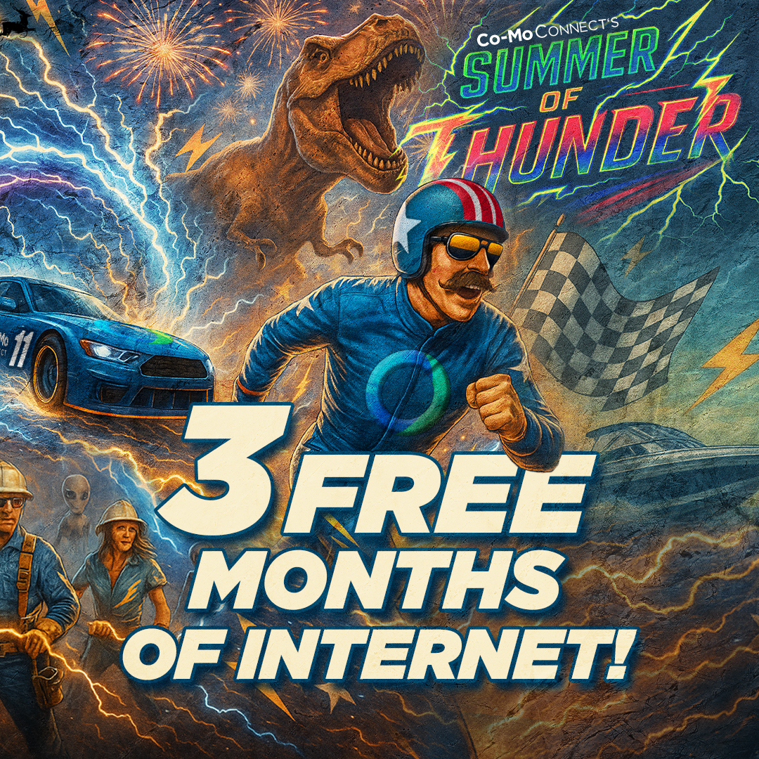 *Terms and Conditions: Customers will receive a free month of internet with an upgrade of their current internet package to 250 Mbps, 1 Gbps, or 2 Gbps (select areas where available). Limited time offer; subject to change; valid to qualified residential customers who have no outstanding financial obligation to Co-Mo Connect. Customer may upgrade their Internet speed only once during the two-month promotional period. Customers may not downgrade to a lower Co-Mo Internet package for 30 days after agreeing to the terms of an upgrade. Standard Internet rates apply after the free promotional month. Some restrictions may apply. Not valid with other offers. Offer expires 8/31/2025.